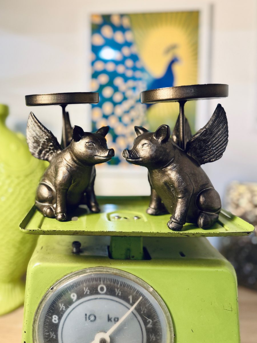 Coppia di portacandele retrò in metallo color bronzo scurito, con due maialini alati che sembrano sul punto di spiccare il volo.