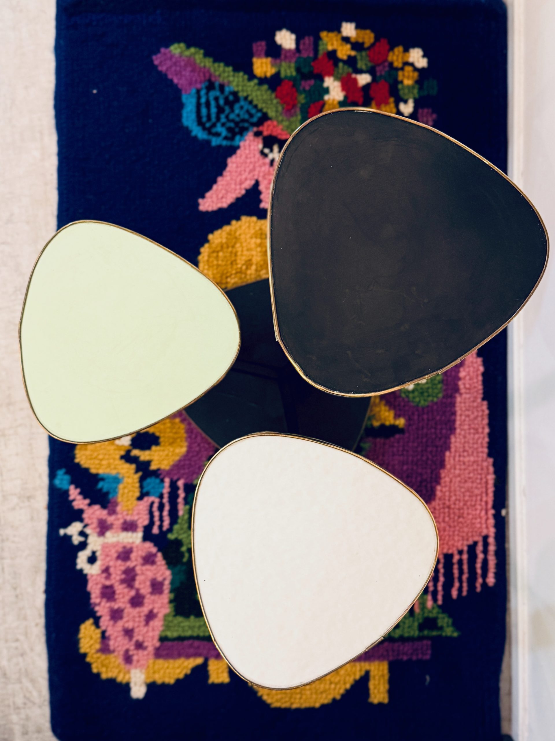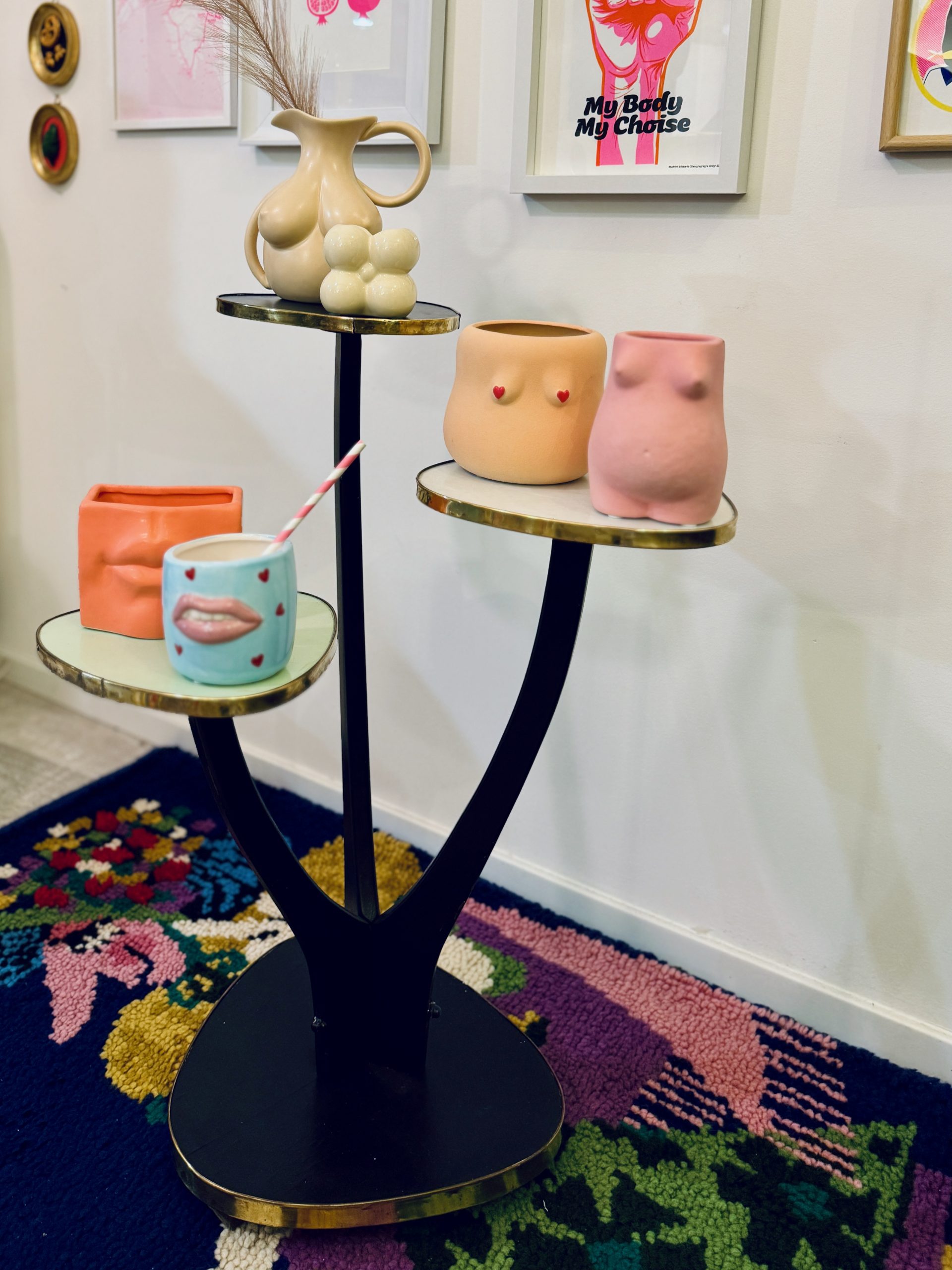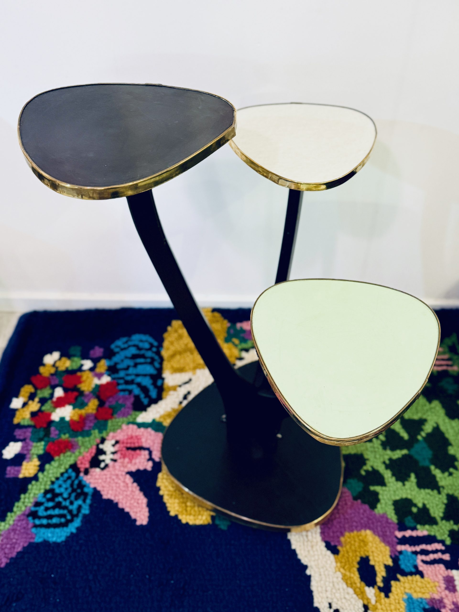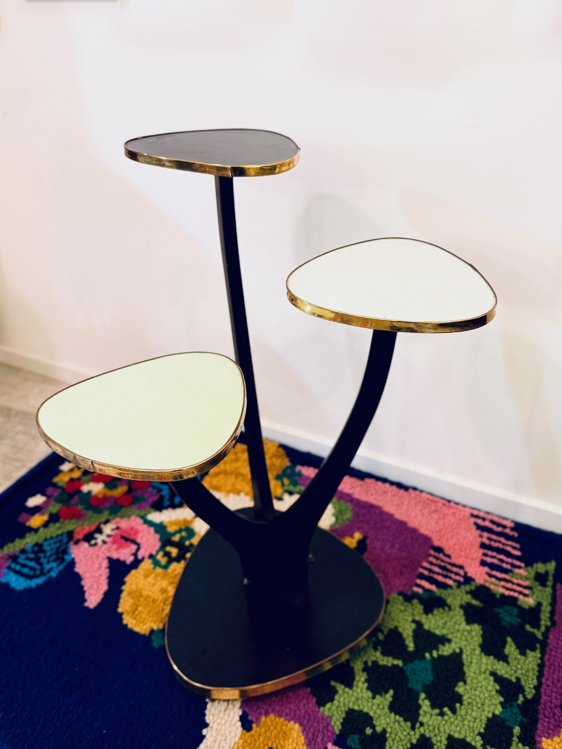 Iconico, autentico, raro e originale, questo portapiante Mi-Century a tre ripiani triangolari è un must have per un arredamento minimalista che vuole aggiungere un tocco di colore con stile. Magnifico per appoggiare la tua mini foresta urbana, non sottovalutare il suo uso alternativo come tavolino di servizio accanto al divano o come comodino. I dettagli tipici in formica e ottone, con le gambe in legno, testimoniano le sue origini tedesche.